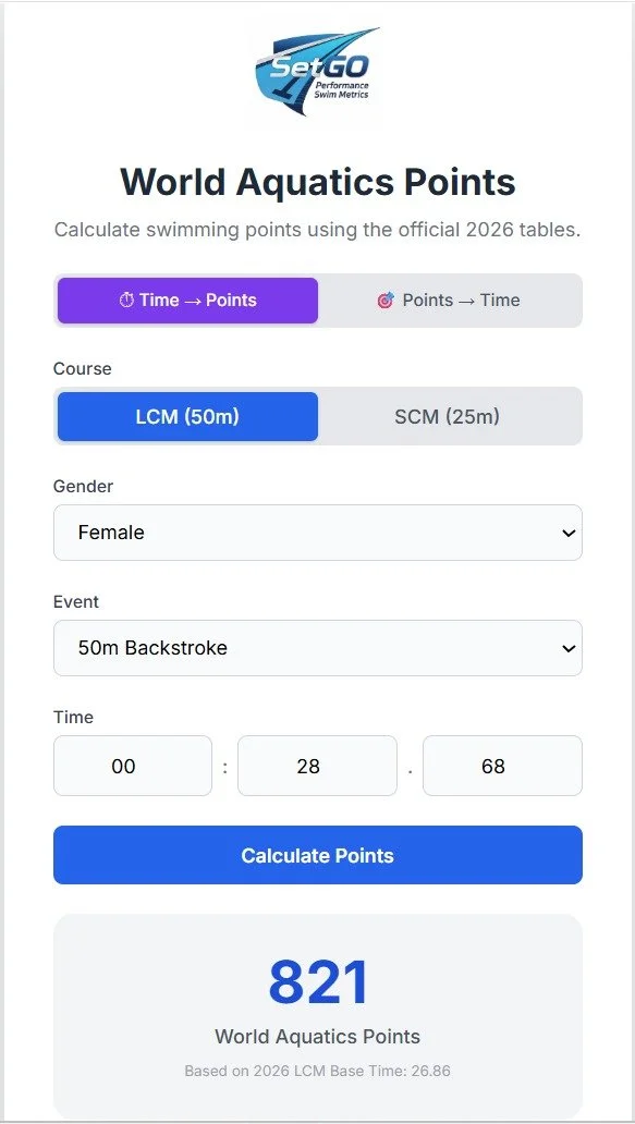 Previously known as FINA Points, the World Aquatics Points system allocates a numerical value to every swim. Its universal value lies in its ability to provide a fair and objective comparison of performances across different events, strokes, and distances. The system is anchored by a 'base time' for each event, which is set annually based on elite global results and is worth exactly 1000 points. This allows any swim, anywhere in the world, to be measured against a single, world-class benchmark, making it an essential tool for tracking progress, qualifying for major competitions, and evaluating a swimmer's performance on a global scale. Now updated using the 2026 Base Times…